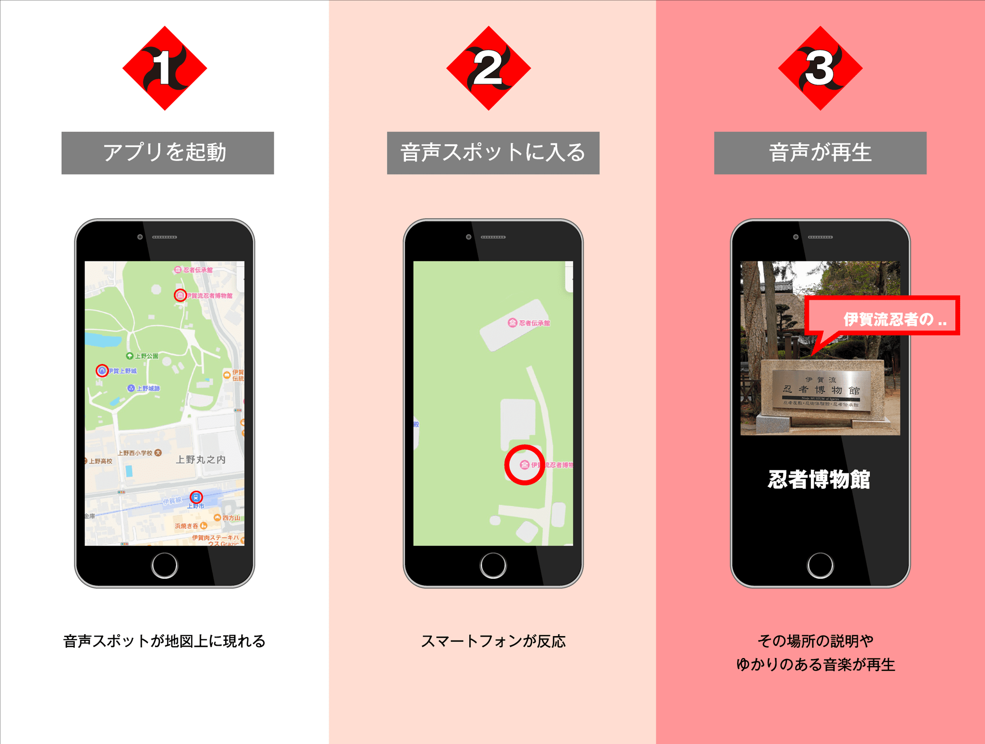 アプリを起動した状態にしておくだけで、NINJAルートにある様々な観光スポットで、NINJAが多⾔語で観光ガイドの役割をしたり、時には敵のNINJAから守ってくれたりと、かつての大名や将軍の傍らにいて、様々な情報を与えてくれた、NINJAそのものような存在になってくれる。