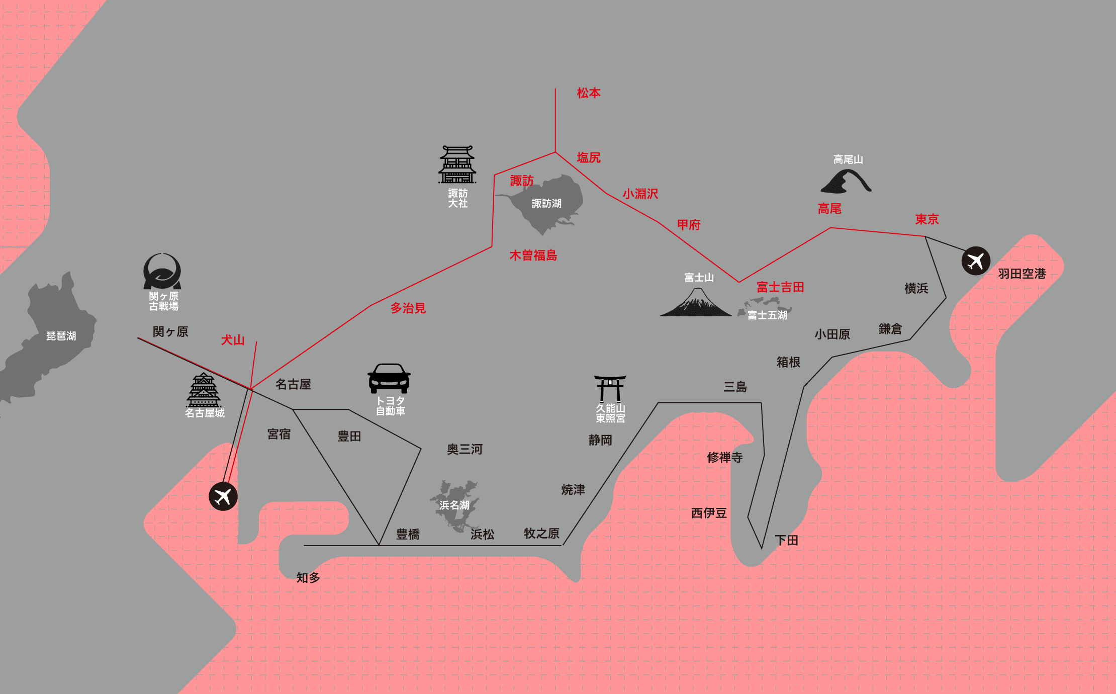 江戸と京都を結ぶ主要道路のひとつ・東海道をたどるルート。天下分け目の関が原に始まり、徳川家康ゆかりの名古屋城、静岡の茶畑や海岸線、箱根温泉、江の島の活気ある仲見世、歴史情緒漂う鎌倉の寺社をめぐり、江戸に向かう。大動脈とも言われる東海道周辺の、歴史的にも大きな役割を果たしてきた場所をおさえ、もちろんグルメや絶景も欠かさない。時代の転換点となった関が原から江戸に渡るこのルートを、かの歴史上の人物も通ったのだろうか。